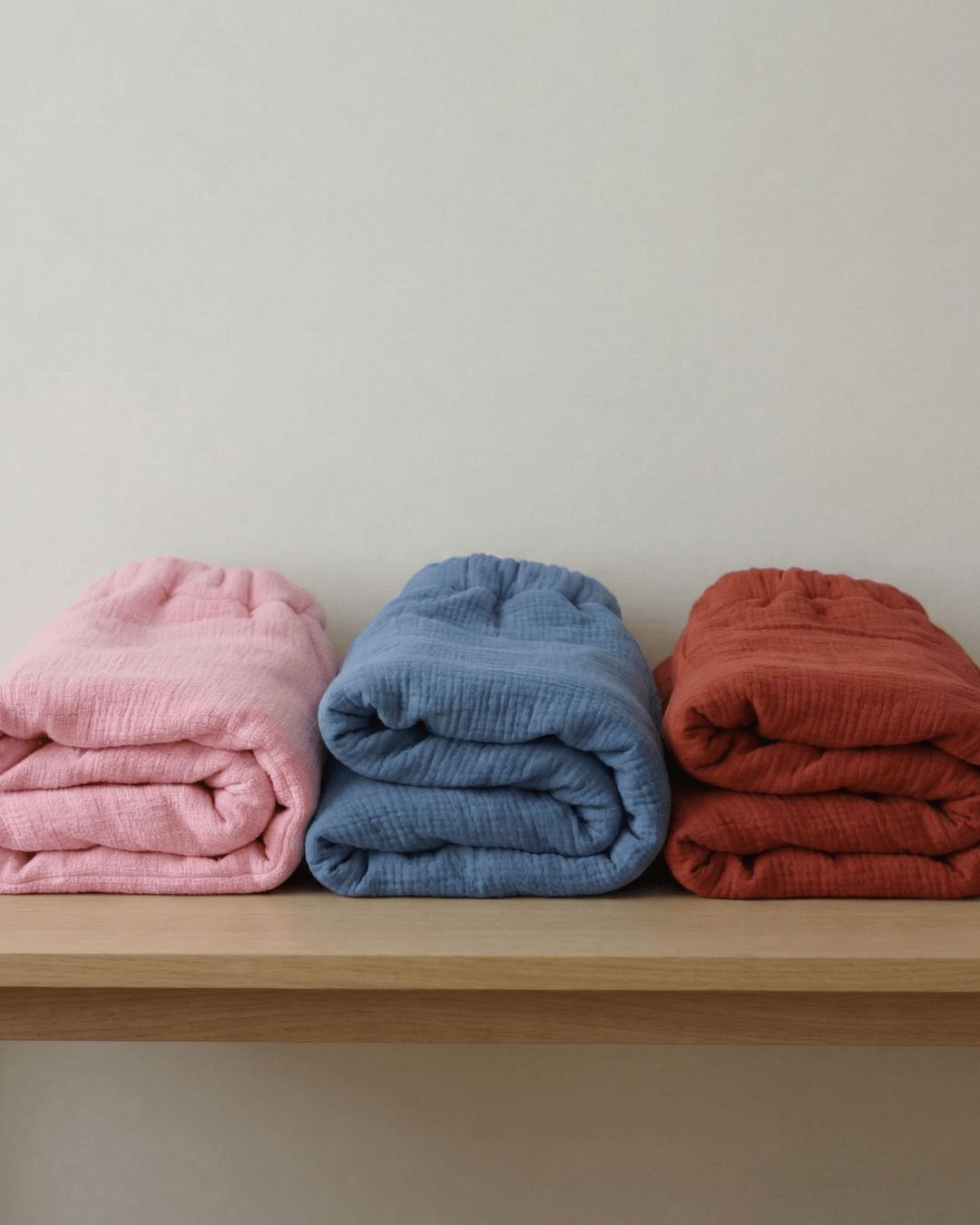 *Please note that bubble gauze, the exterior material, is super soft but fragile. Avoid brushing the material that can potentially nick the fabric such as velcro, harsh grounds and animal claws.