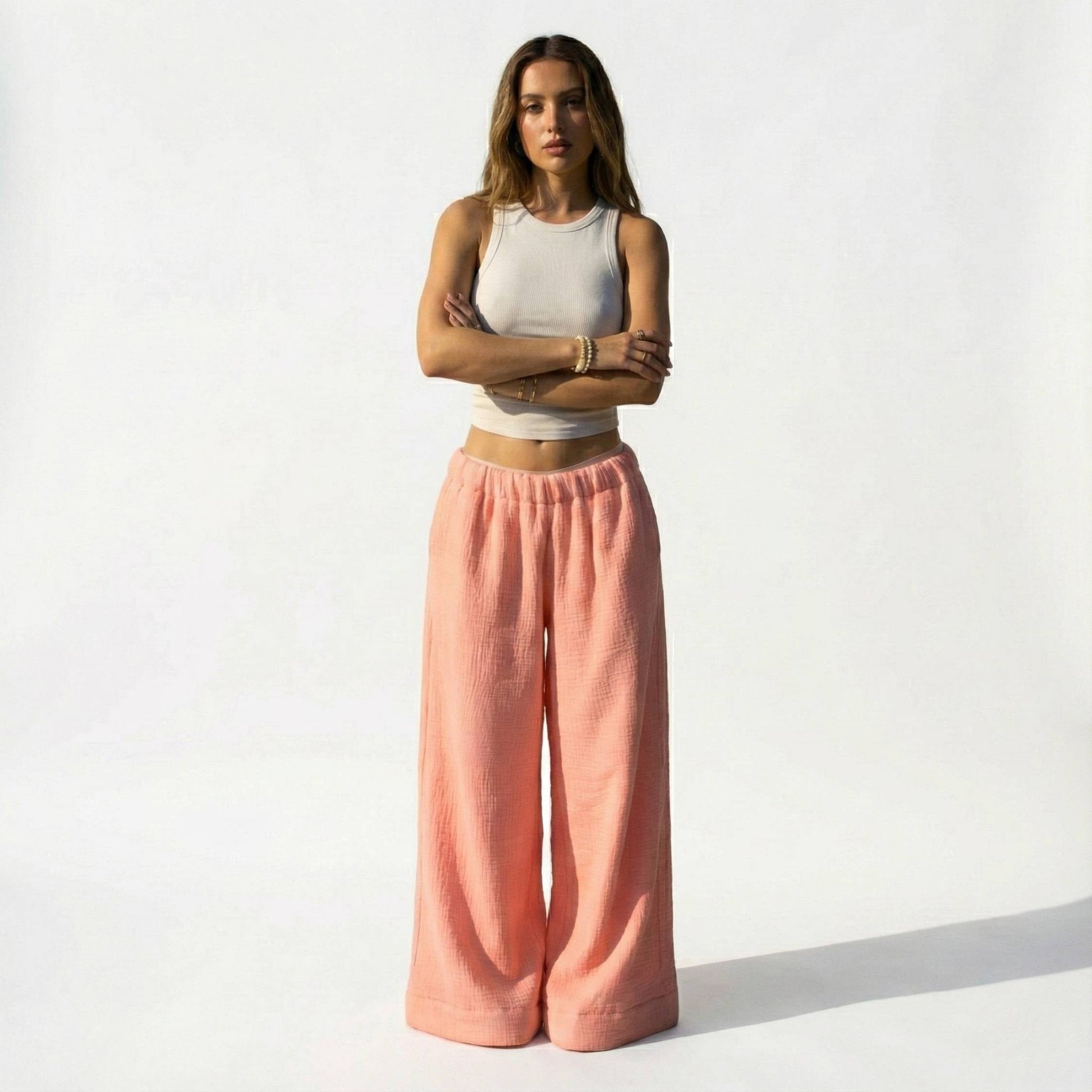 The dusty Pink shade strikes the perfect balance between statement-making and wearable. This muted rose tone flatters all skin tones and works beautifully with white tops for a fresh feminine aesthetic, grey and cream for soft tonal dressing, or even paired with other pastels for a modern colour-blocked look. It's a cheerful, mood-lifting colour that adds personality to your casual rotation without overwhelming your outfit.